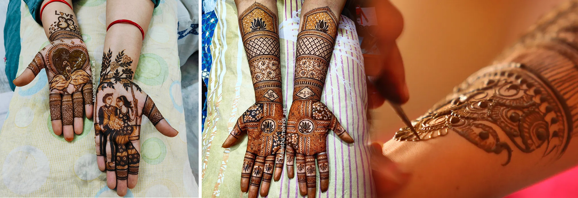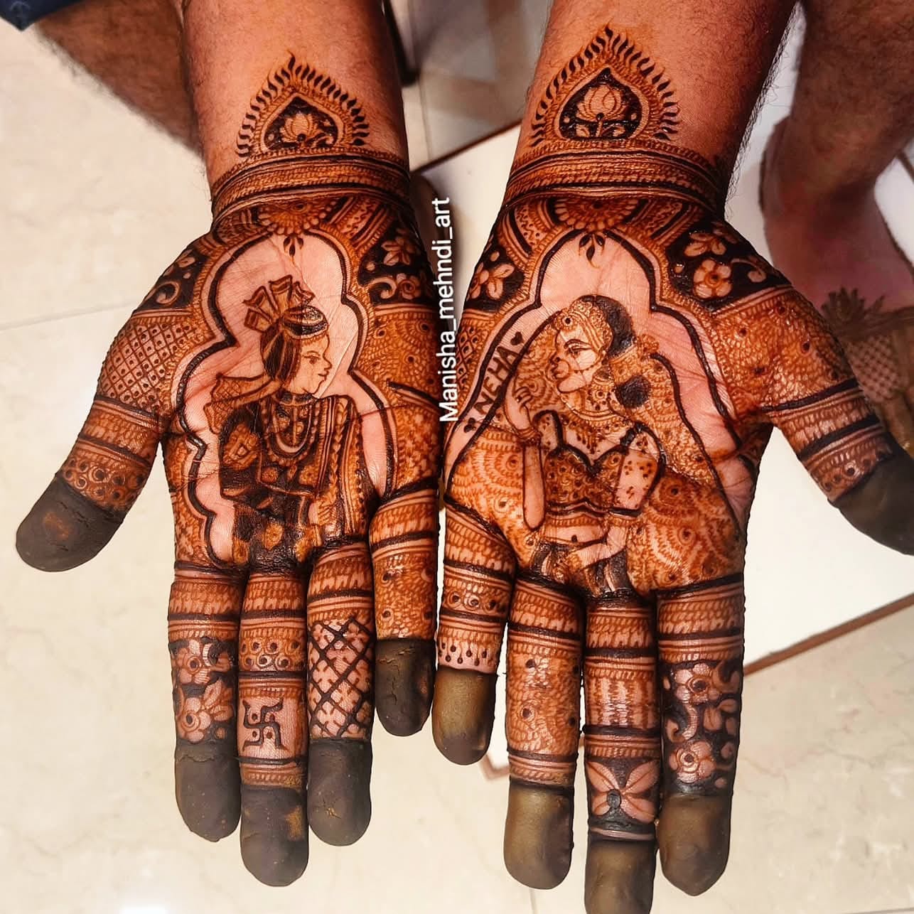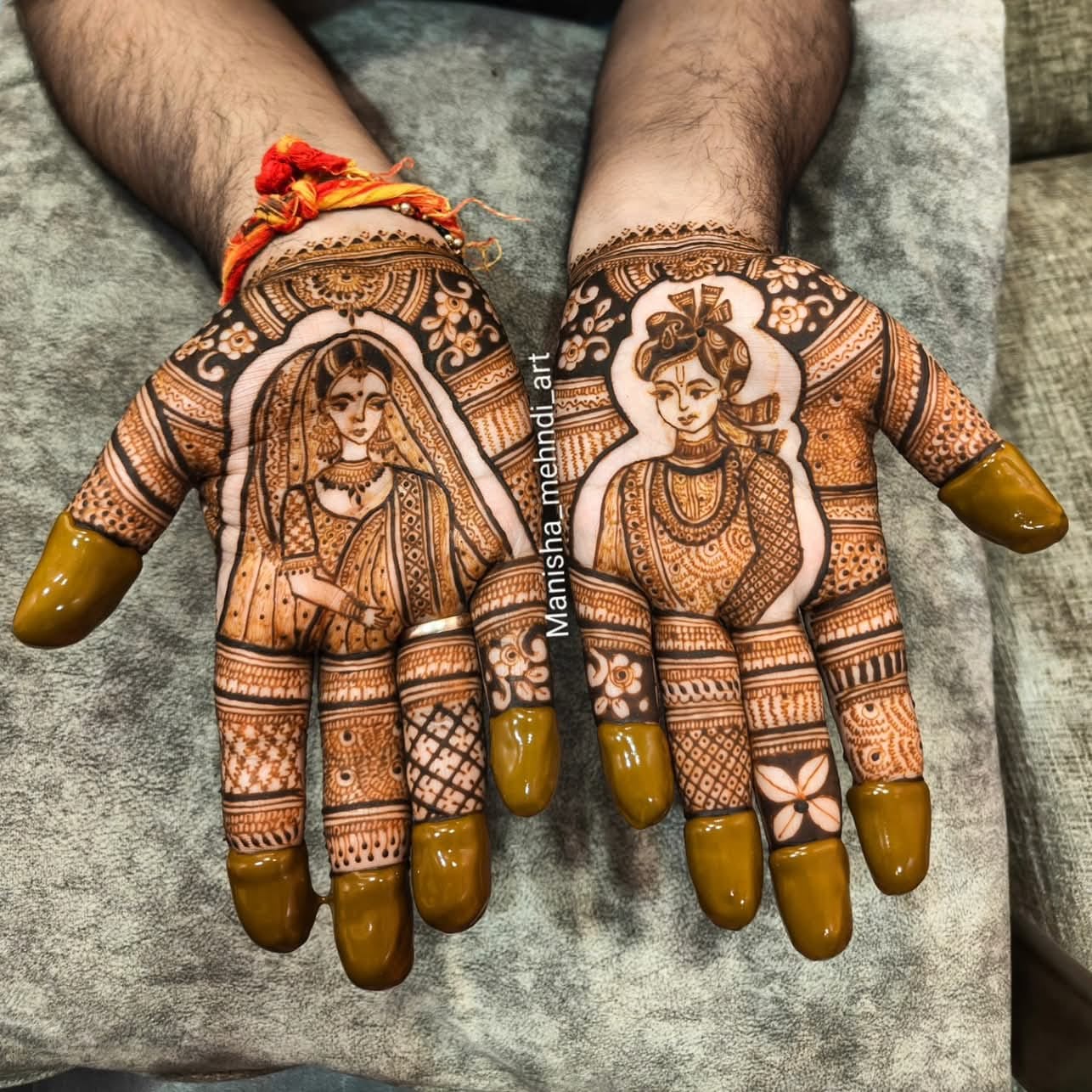 Portrait mehndi, a relatively new trend, involves creating detailed portraits of the bride (or other figures) on hands or arms, adding a personal and artistic touch to mehndi designs.